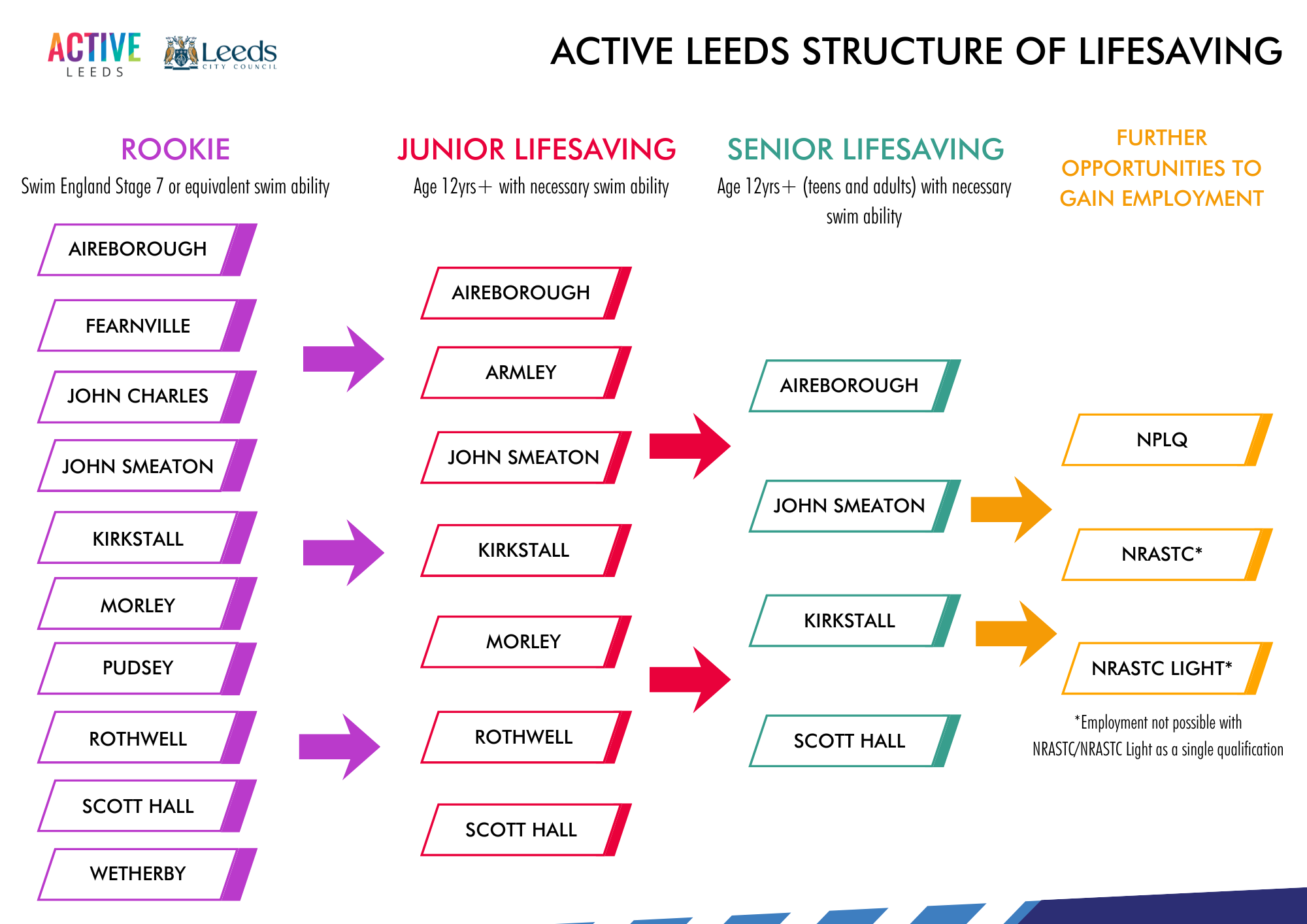 Looking for National Pool Lifesaving Qualification, NRASTC or NRASTC Light? Check out our training page Training | Active Leeds for further information on courses etc.
